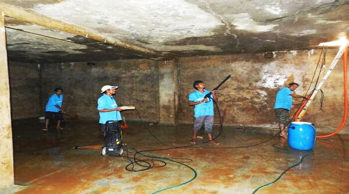 Bước 3: Sử dụng vòi phun phun lên thành bể nước và đáy bể nước, vừa phun vừa sử dụng dụng cụ cọ để đảm bảo chất cặn trôi sạch.